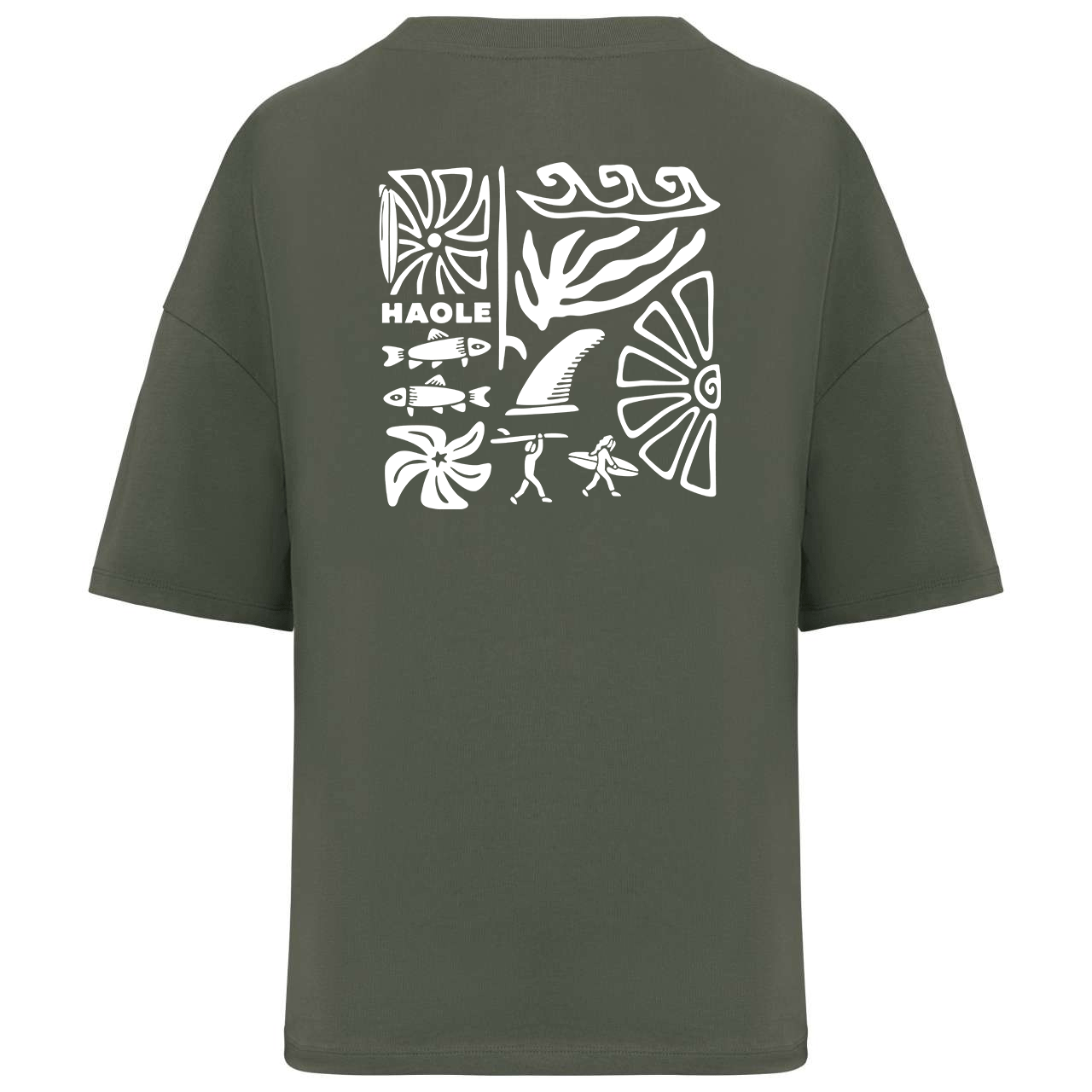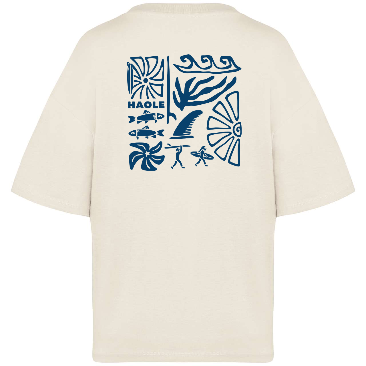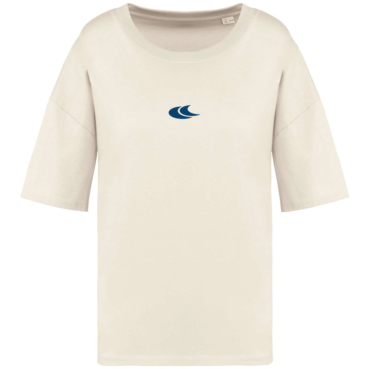 Női oversize póló bő szabással és ejtett vállakkal. Letisztult forma, strukturált esés és prémium anyaghasználat. Minimalista grafika, ami a mozgás és a flow érzetét hozza – minden felesleges zaj nélkül.